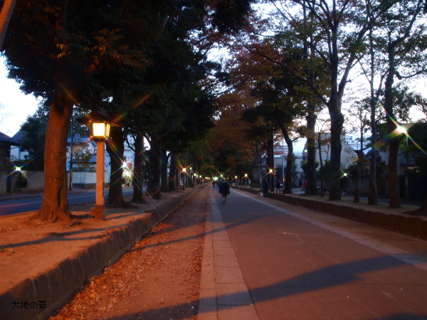 日もだいぶ傾き、薄暗い参道を街灯が照らします。