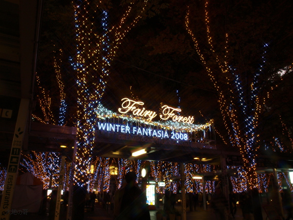 電飾で形作られる「Fairy Forest WINTER FANTASIA 2008」の文字。